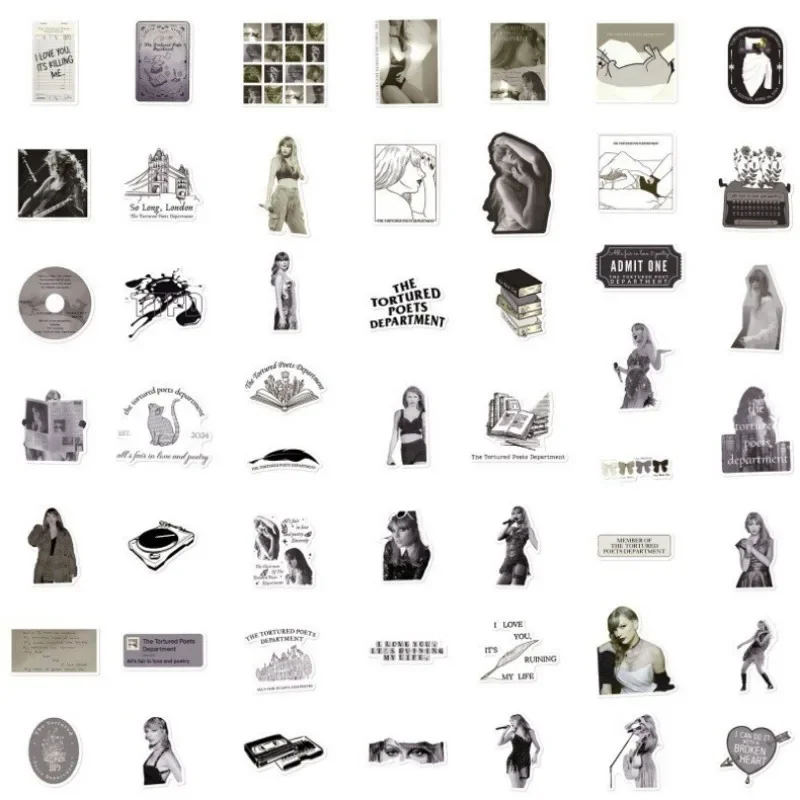 This stunning 50-piece sticker collection captures the aesthetic of Taylor Swift’s The Tortured Poets Department album in moody, sepia-toned imagery. The pack features an eclectic mix of vintage-inspired designs, candid performance shots, poetic typography, and iconic album artwork arranged in a collage-style layout that celebrates the album’s literary theme. Perfect for decorating your laptop, water bottle, journal, or anywhere you want to display your love for this era. Each sticker showcases the artistic direction and storytelling that defines this album.