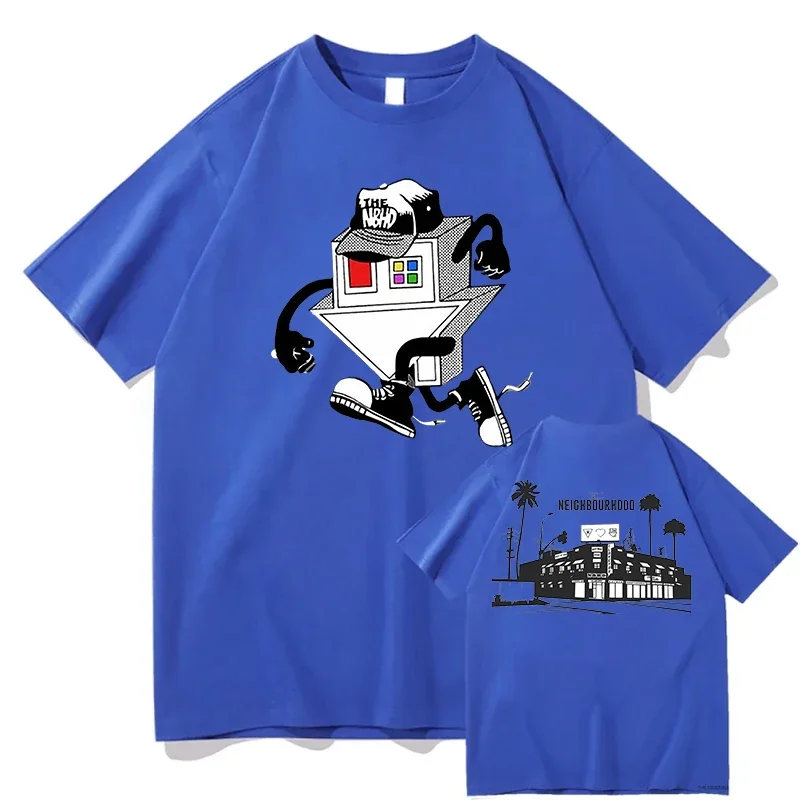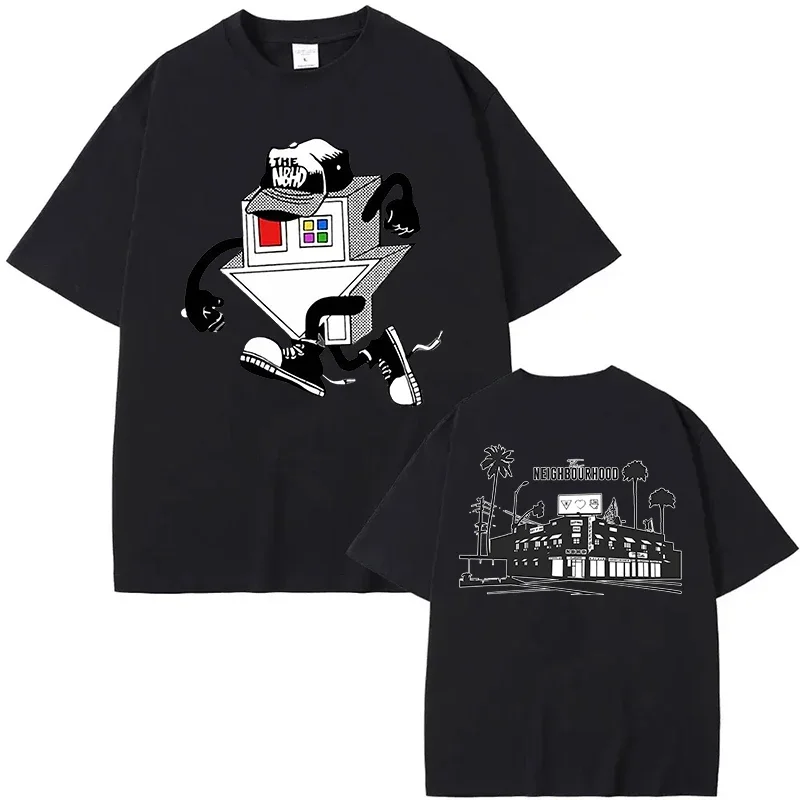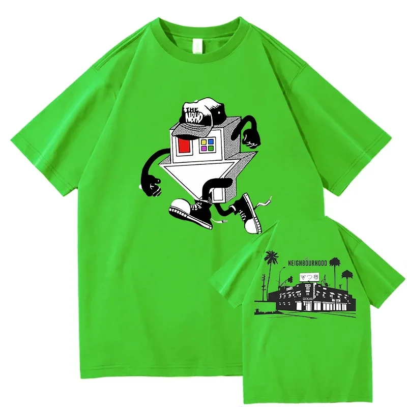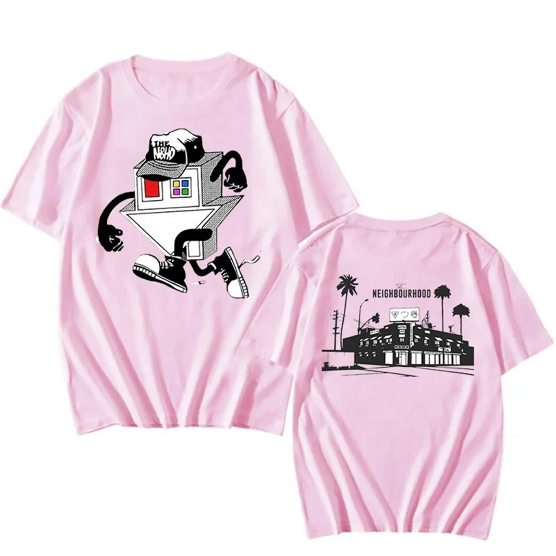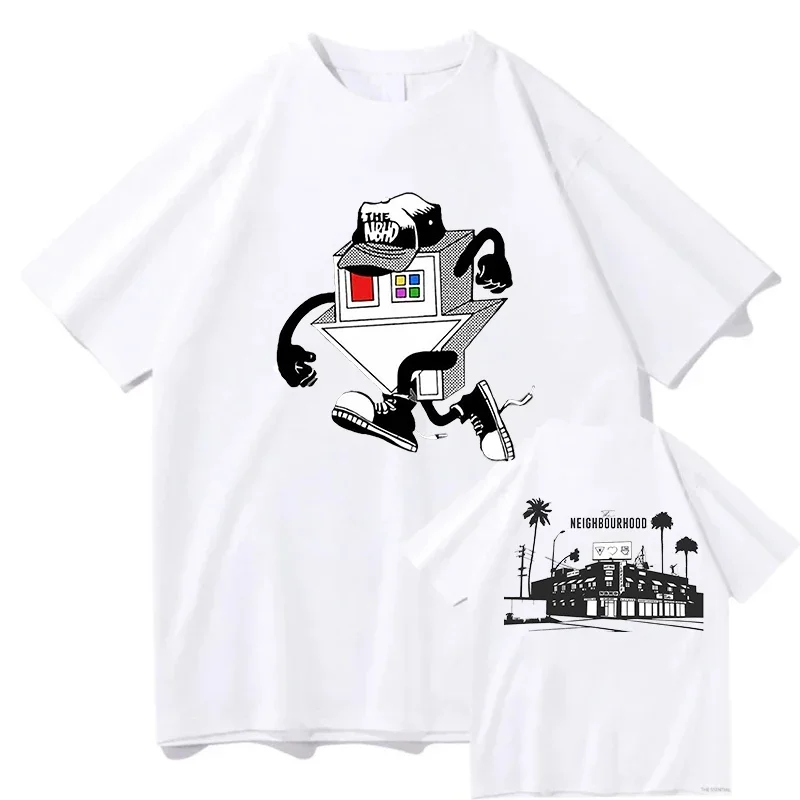This The Neighbourhood graphic tee is an instant collector’s piece for fans of the iconic band. The front features a bold, retro-inspired illustration of a house character with attitude, complete with a tilted head and sneaker-clad legs that perfectly captures the band’s quirky aesthetic. The back rounds out the design with a minimalist Neighbourhood skyline scene featuring palm trees and iconic architecture. Printed on a clean cream-colored shirt, this design blends vintage vibes with modern streetwear style that any true fan will want to rock.